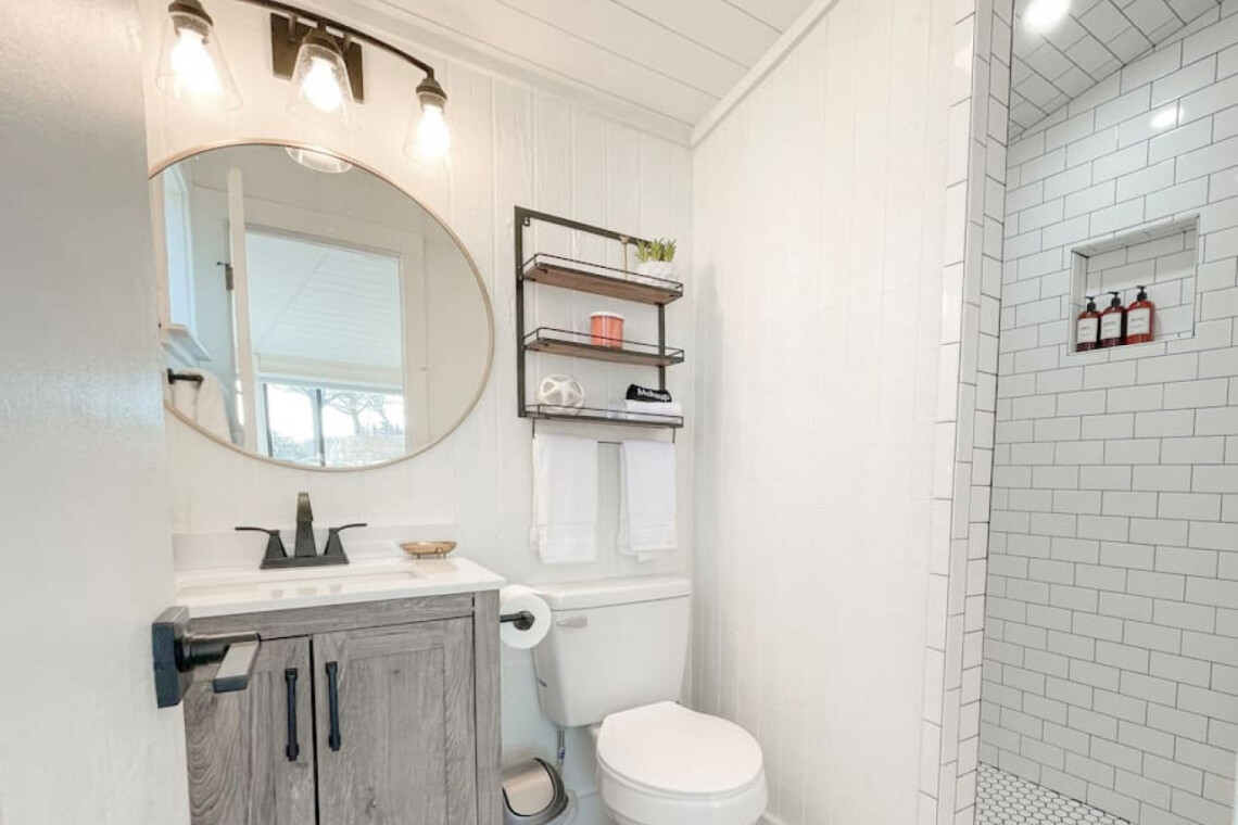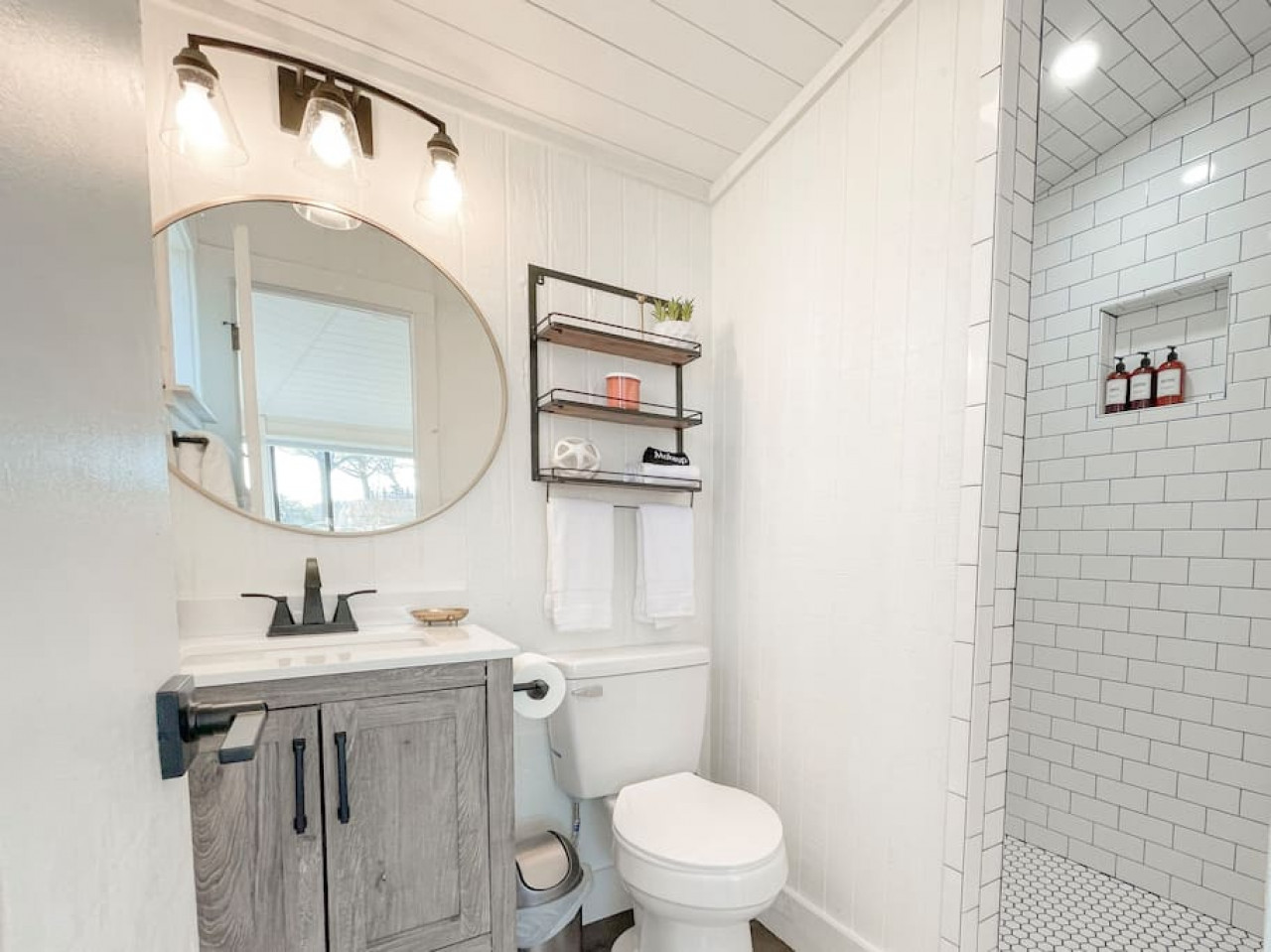• The fully remodeled bathroom has a gorgeous shower with beautiful tile work and views from the vanity! Hair dryer, shampoo, conditioner and body wash provided.