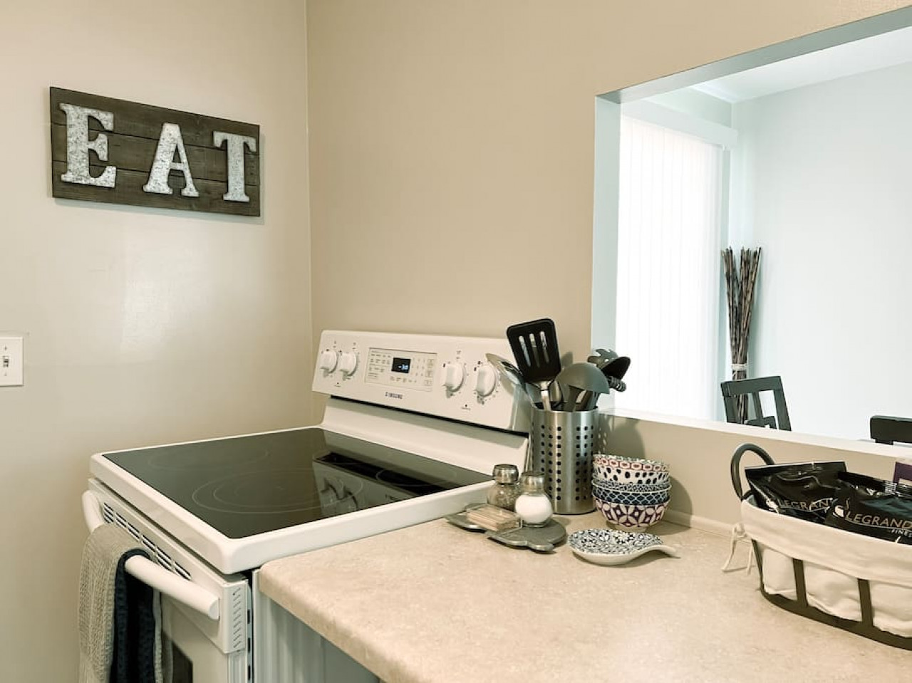 Kitchen comes fully stocked with everything you could imagine. Coffee and tea set up. All the dishes and utensils for cooking or a microwave for keeping it simple.